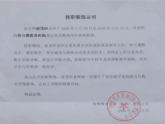 凌茂钞老师则在快慢教育咨询(四川)有限公司挂职锻炼。通过参与教育咨询项目,他深入接触了家庭教育、学业规划等多个领域,对教育行业的多元化发展有了更深刻的体悟。