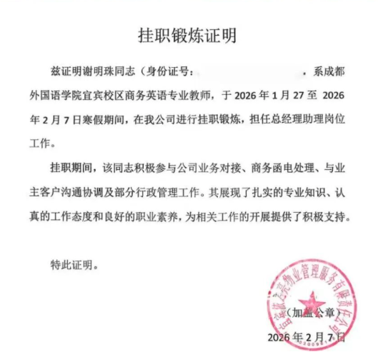 在宜宾依之亮物业管理服务有限责任公司,谢明珠老师同样在基层岗位挂职锻炼。她通过参与企业日常管理,深入了解服务行业的运营逻辑与人才需求,为今后的教学改革积累了宝贵的行业认知。