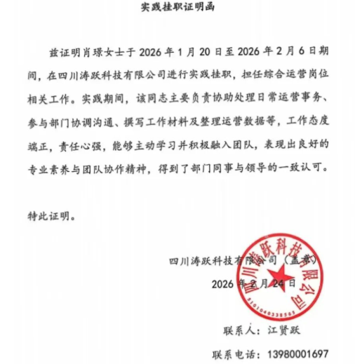 肖璟老师在四川涛跃科技有限公司度过了充实而紧张的挂职时光。她负责综合运营岗位工作,协助处理日常运营事务,参与部门沟通协调,撰写工作材料,整理分析运营数据。她严谨的工作态度与高度的责任心,赢得了部门同事与领导的一致认可。她用行动证明,师者不仅在讲台上传道授业,也能在职场上独当一面。